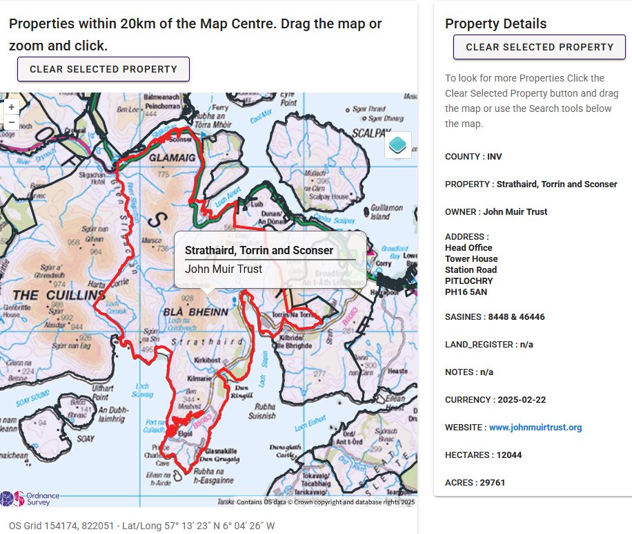 A map showing land ownership on Ordnance Survey mapping. With a Subscription model at different rates for Private through to Corporate rates. Backed by a searchable database. An Andy Wightman project to provide curious individuals and businesses with a quick way to get details on land ownership in Scotland